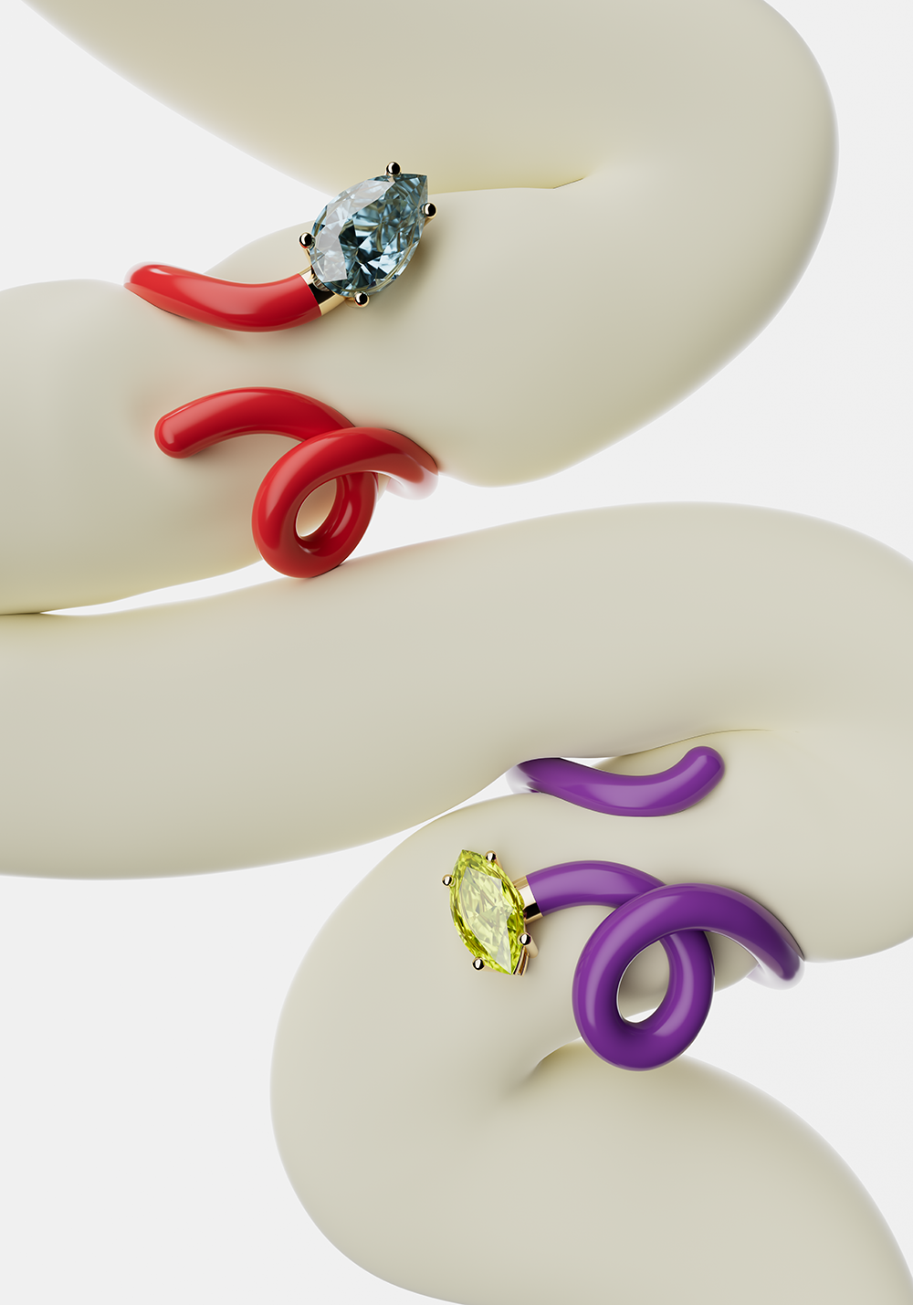 Baby vine tendril ring in yellow gold and silver, featuring hand-painted purple enamel and a marquise-cut peridot.