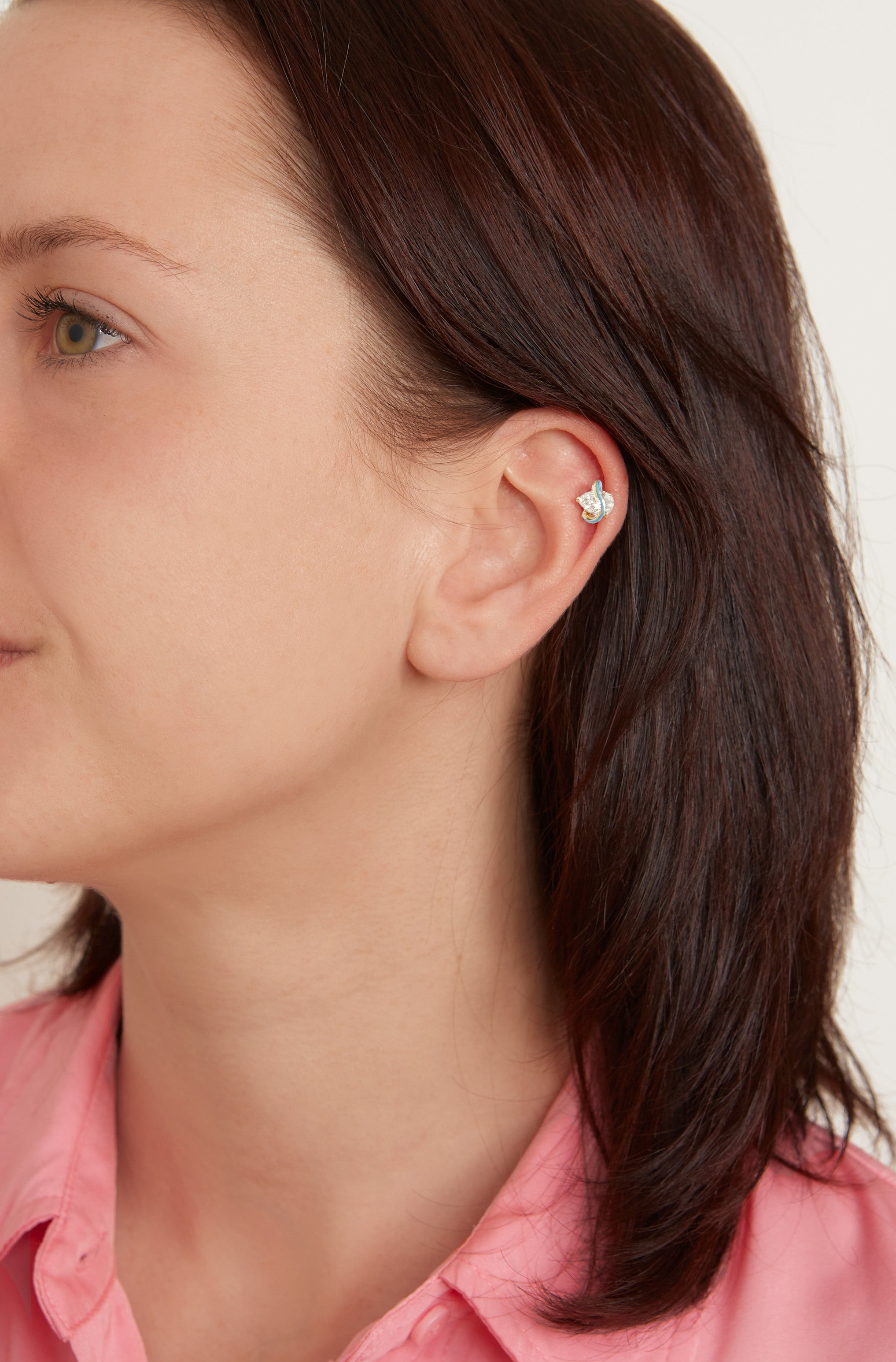 Yellow gold single diamond stud earring featuring a pear-cut diamond with a hand painted baby blue half-half enamel gold vine wrap.