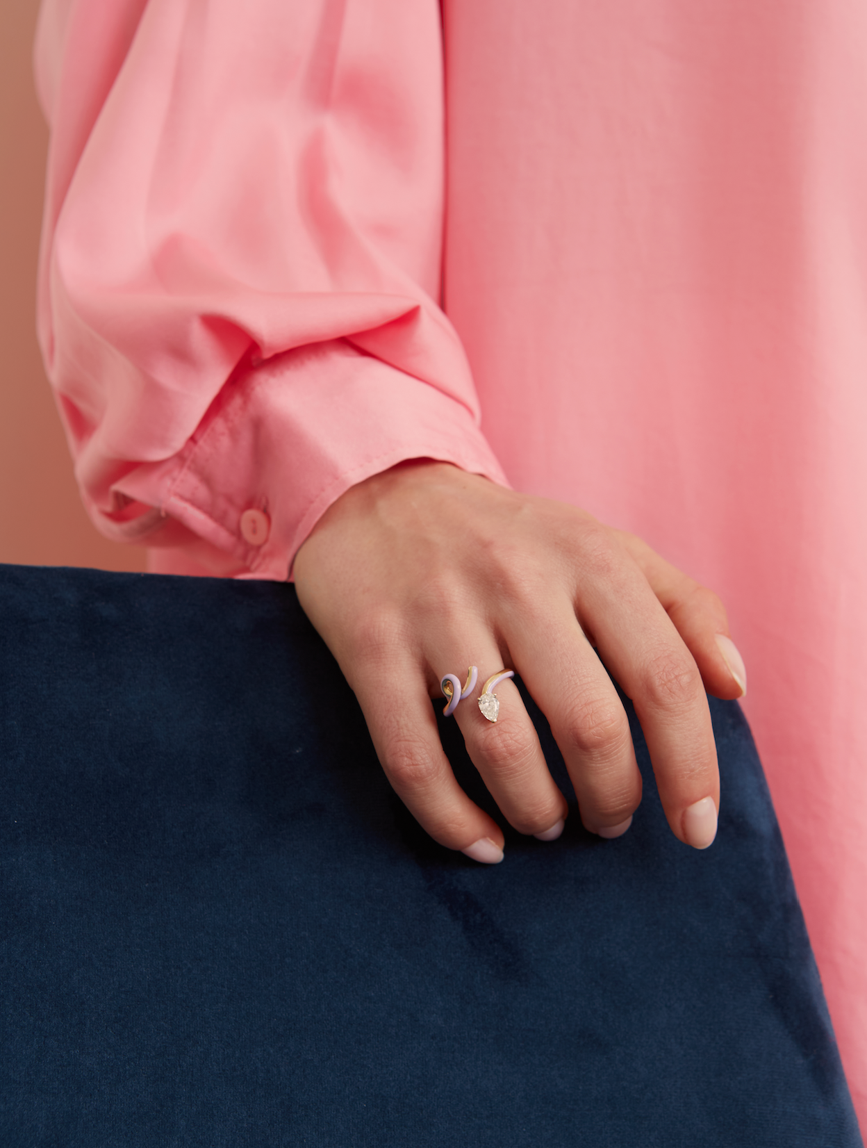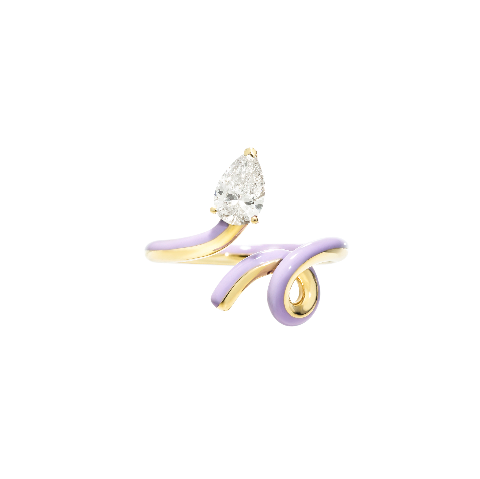 Introducing our exclusive Baby Vine Ring in 18kt gold, featuring a pear cut diamond and a delicate handpainted enamel in a lovely lavender hue.