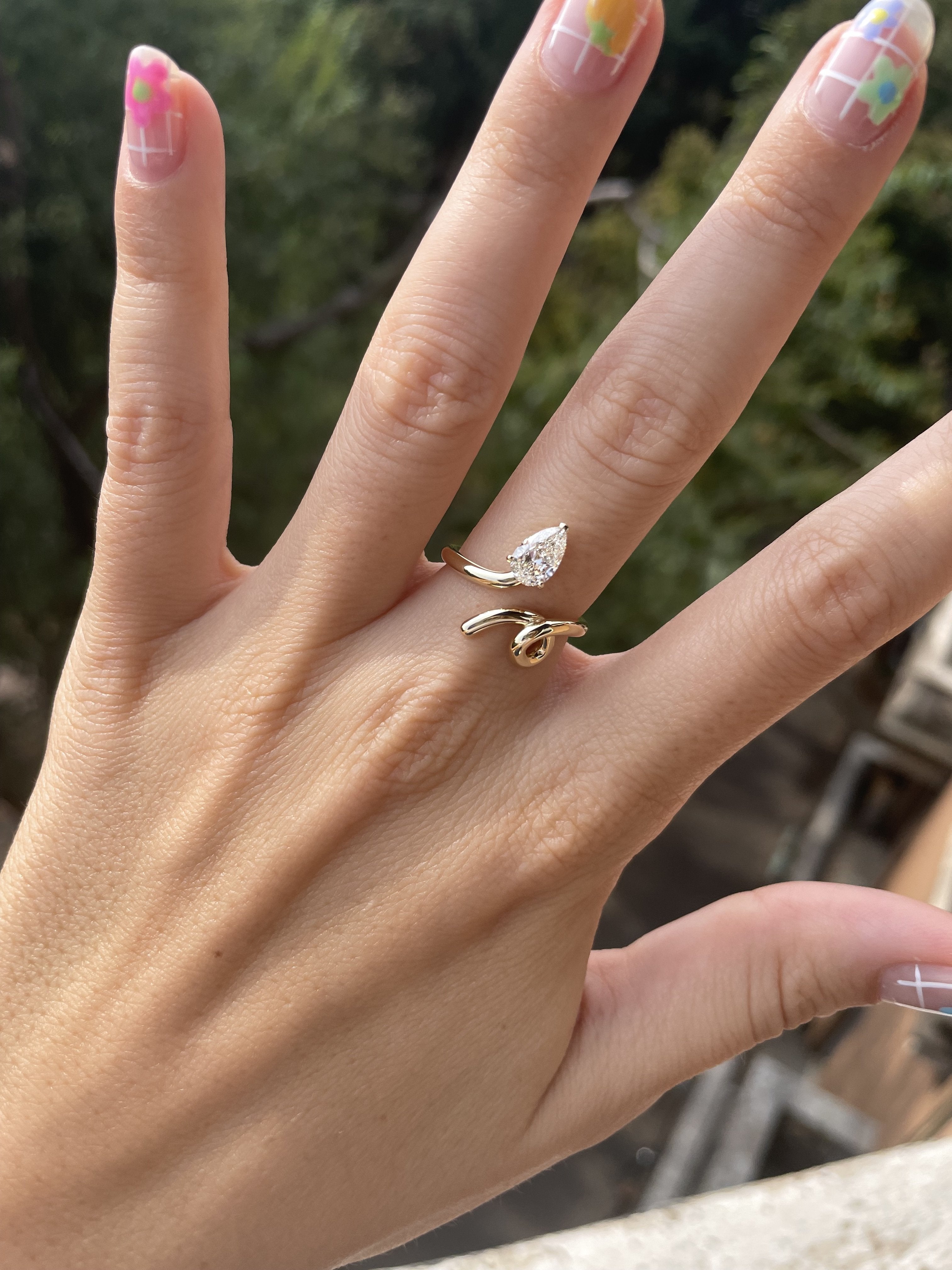 Indulge in the ultimate luxury with our stunning 18kt gold Baby Vine Ring, embellished with a pear cut diamond. Elevate your sense of style with this exclusive statement piece.