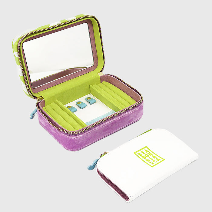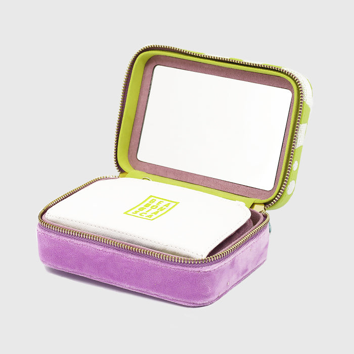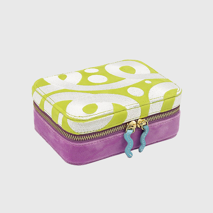 The Bea Bongiasca X WOLF - JEWELLERY TRAVEL ZIP CASE features the iconic loop design crafted from wisteria and lime green velvet. The delicate white patterns are intricately embroidered onto the case, while a pale gold zipper closure with lilac tape adds a touch of elegance. Inside, a mirror and removable white zipped pouch make this case functional and stylish.