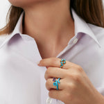 Baby vine tendril ring in yellow gold and silver, featuring hand-painted Capri blue enamel and a marquise-cut amethyst.