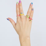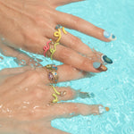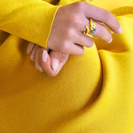 Baby vine tendril ring in yellow gold and silver, featuring hand-painted yellow enamel and a marquise-cut topaz.