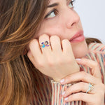 Tetradic ring in yellow gold with lavender, purple, deep purple, blue, turquoise, and baby blue enamel.