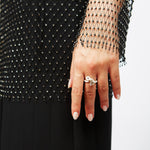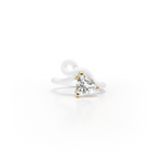 Trillion vine ring in yellow gold and silver, featuring hand-painted white enamel and a trillion-cut rock crystal.