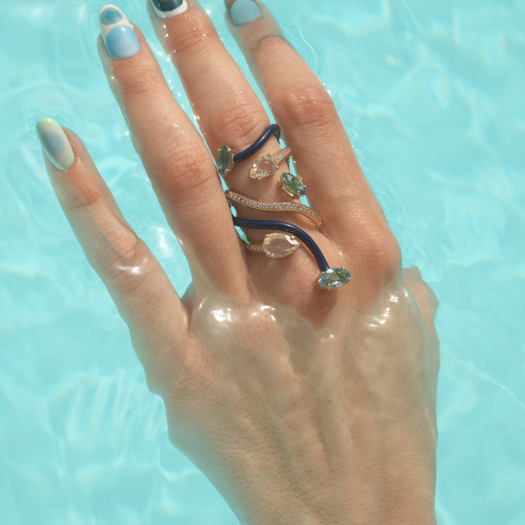 Sinuous colourful vines of enamel on gold and silver give the pieces in this collection a sense of kinetic movement & a bold pop look. Inspired by the concept of climbing plants, "You're So Vine" is a pun that nods to our playful approach to jewelry.
