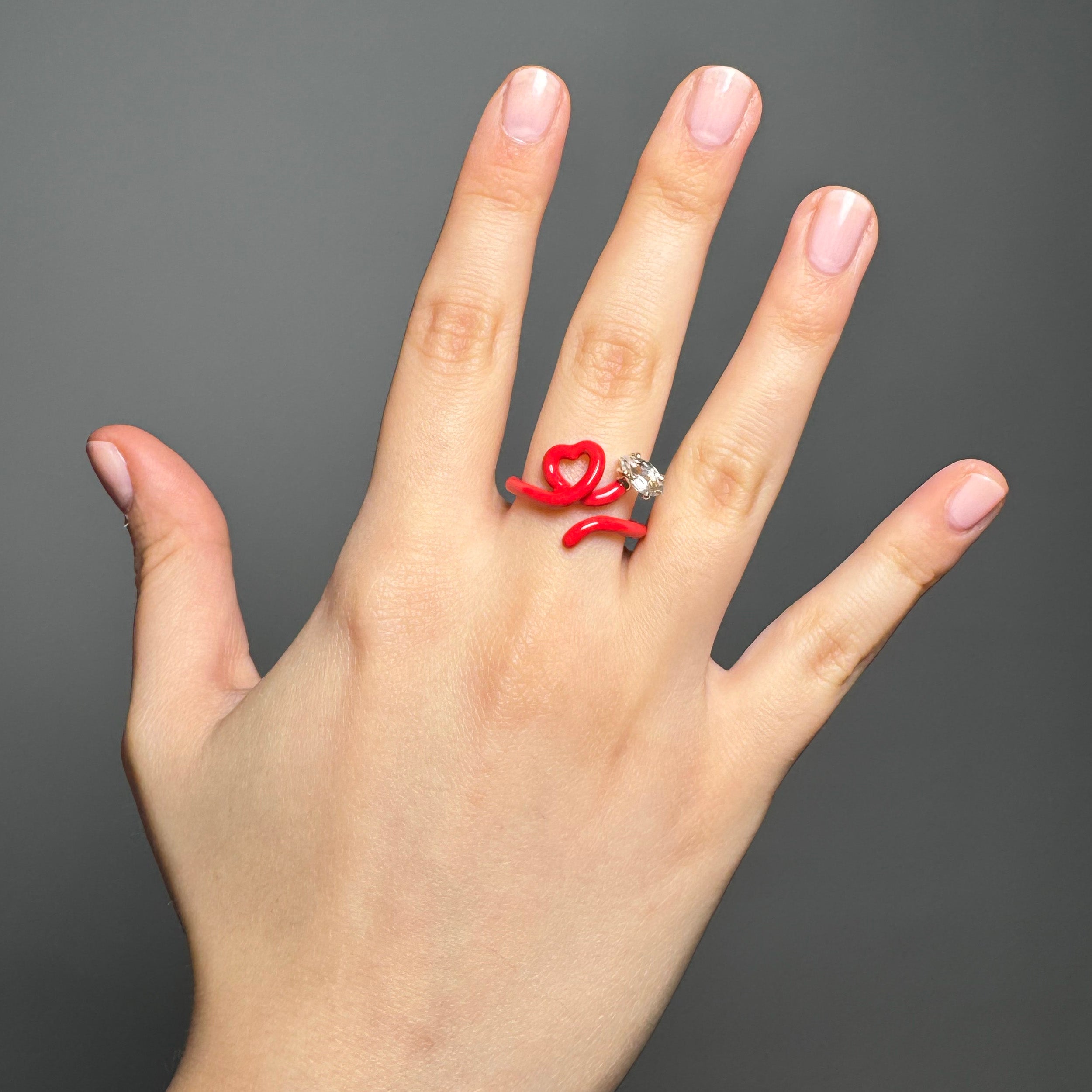 Baby Vine Heart Ring crafted in gold and silver, adorned with hand-painted red enamel. The design features a delicate heart shape on the vine curl, complemented by a stunning marquise-cut rock crystal.