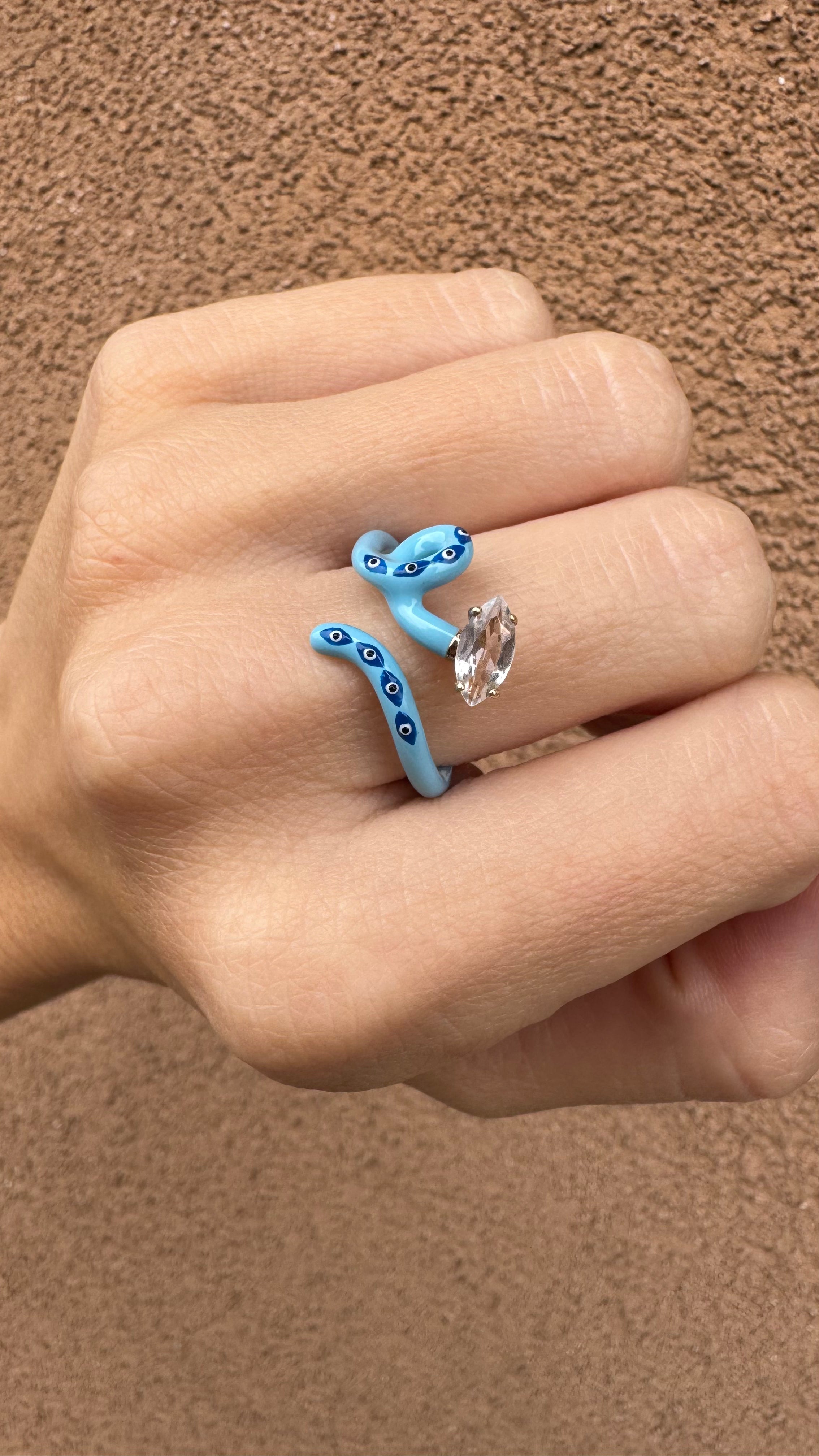 Baby vine tendril ring in yellow gold and silver, featuring hand-painted baby blue enamel with Evil Eye motifs with a marquise-cut rock crystal.