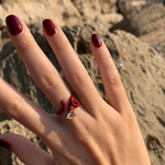 Baby vine tendril ring in gold and silver, featuring hand-painted burgundy enamel and a marquise-cut rock crystal.