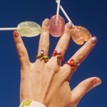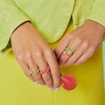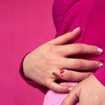 Baby vine tendril ring in yellow gold and silver, featuring hand-painted hot pink enamel and a drop-cut peridot.