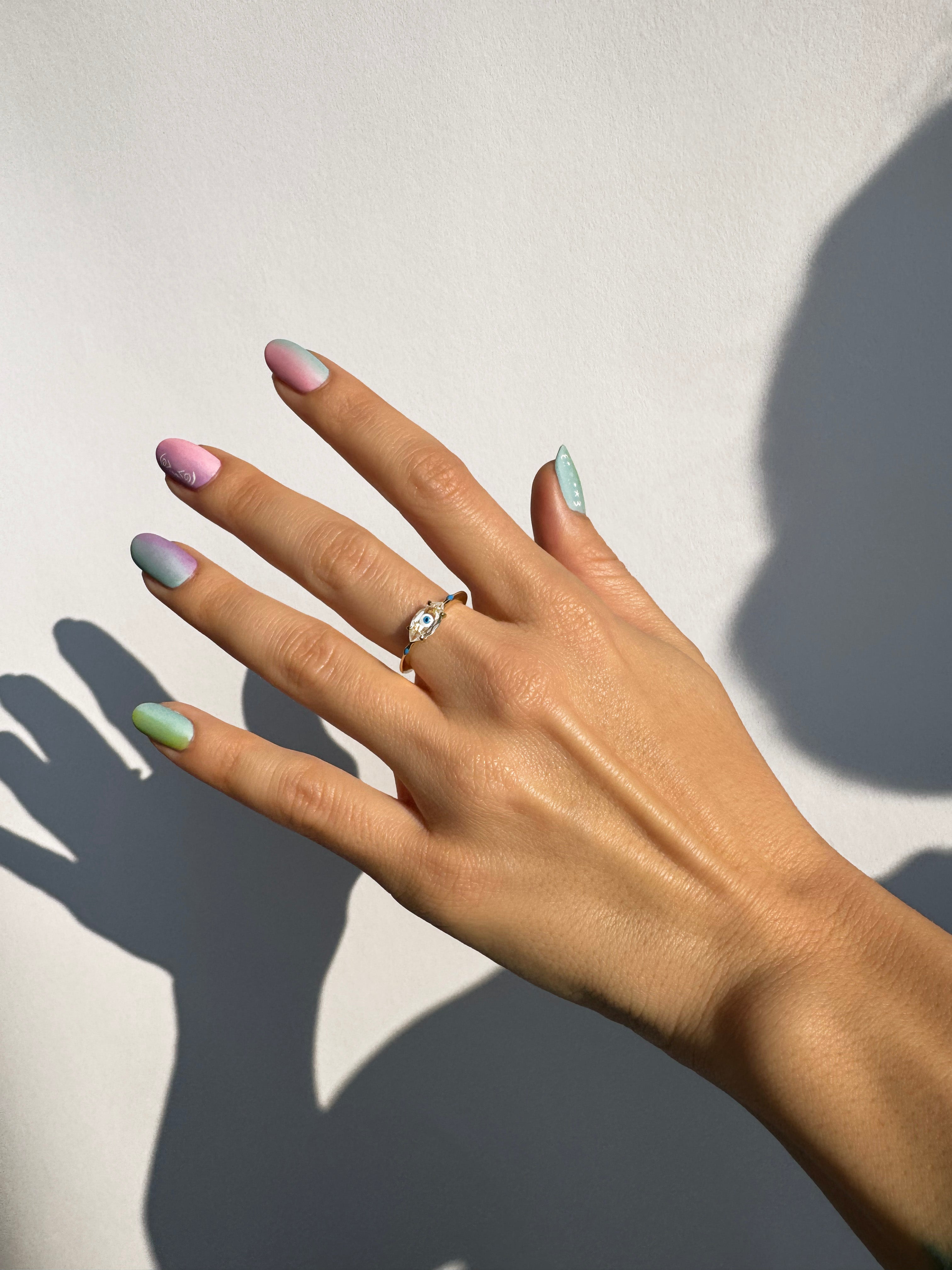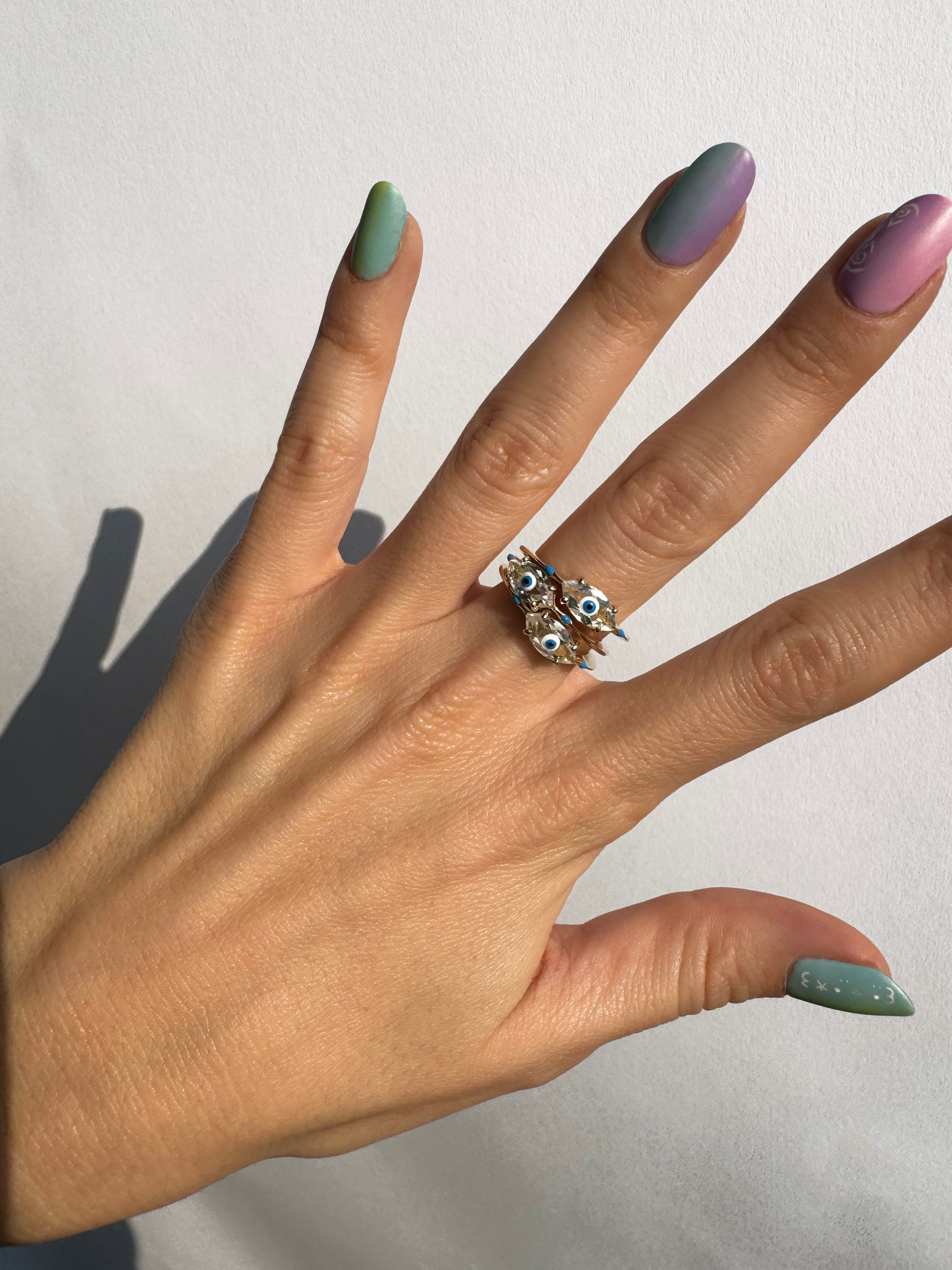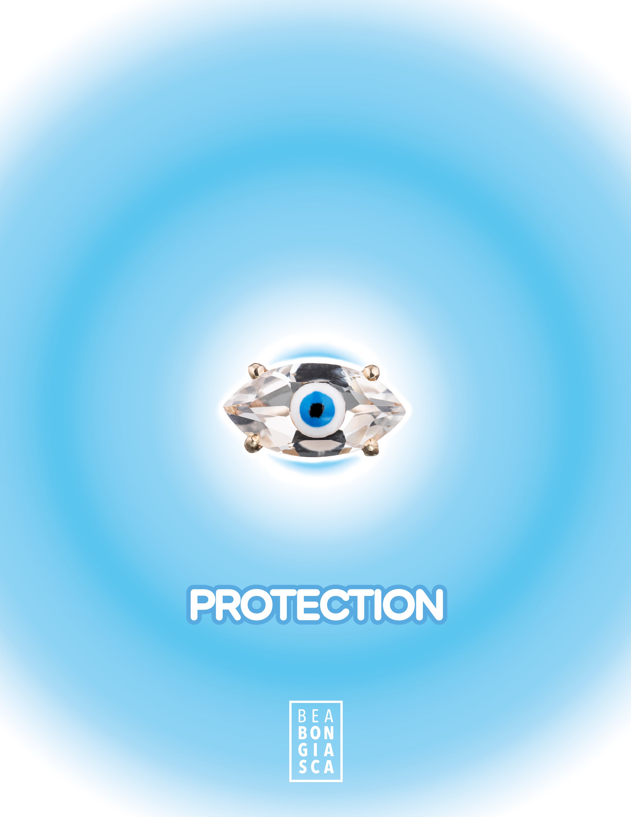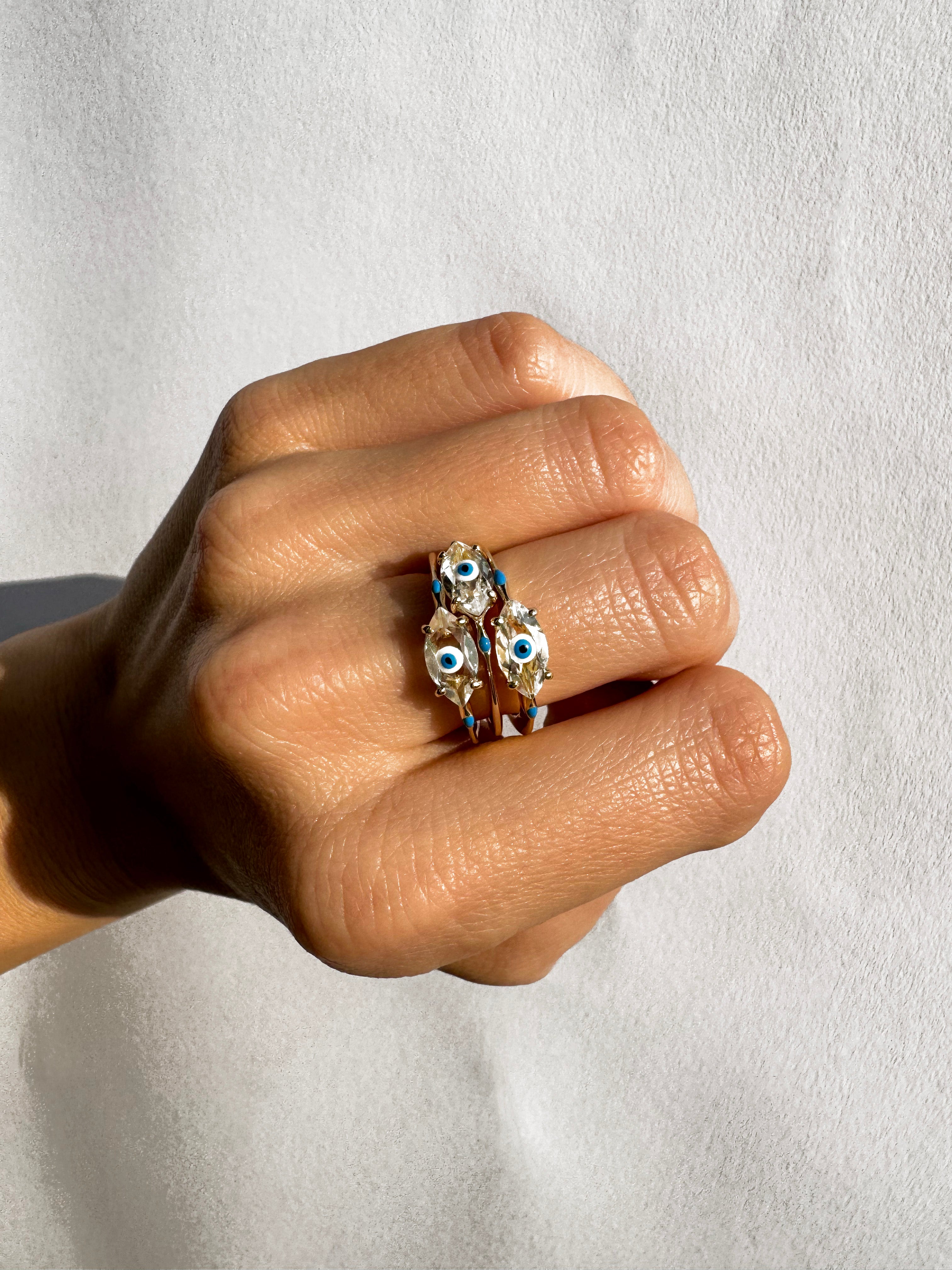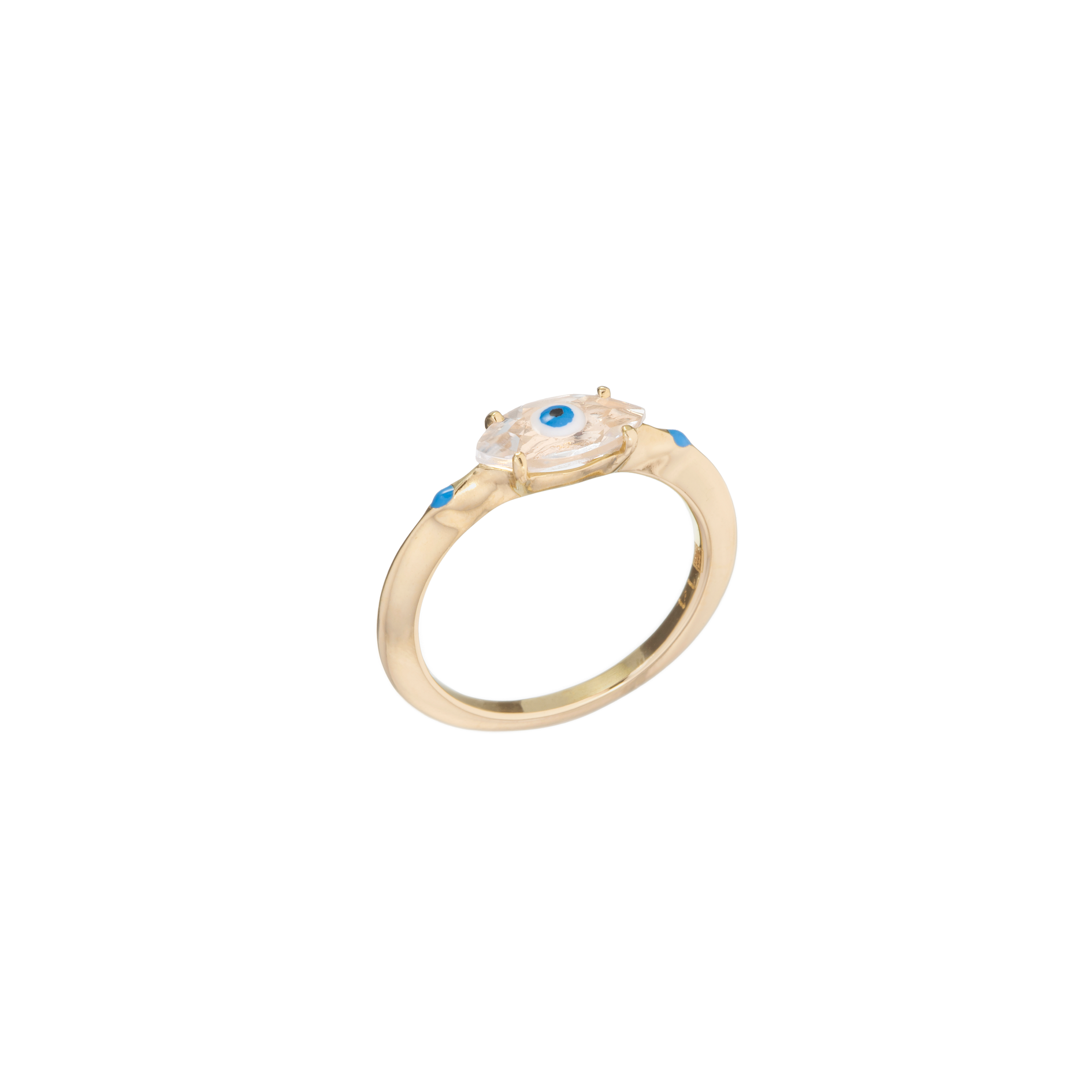 Drawing inspiration from the iconic symbolism of the Evil Eye, cherished across diverse cultures since ancient times, this Fortuneye ring features a marquise-cut rock crystal with an innovative hand-painted eye directly onto the gemstone in hues of turquoise, black, and white enamel. This blue amulet aims to protect us against the evil eye and adversities. Fortuneye protection ring features a marquise-cut rock crystal with an hand-painted eye directly onto the gemstone in hues of turquoise, black, and white enamel.
