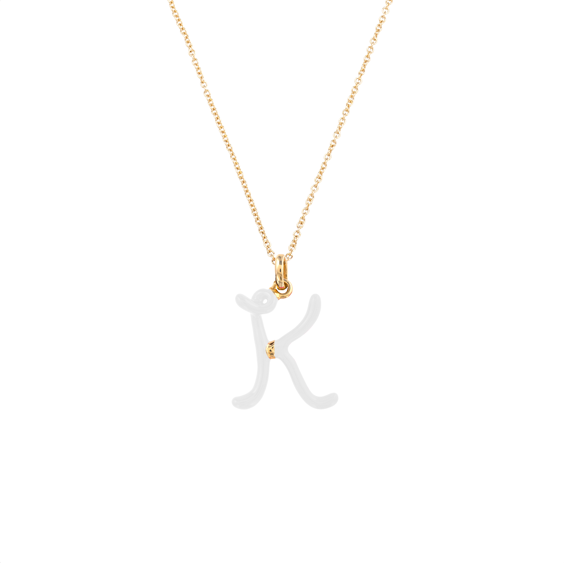 K Letter Necklace in 9kt yellow gold with white enamel.