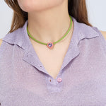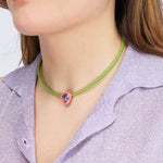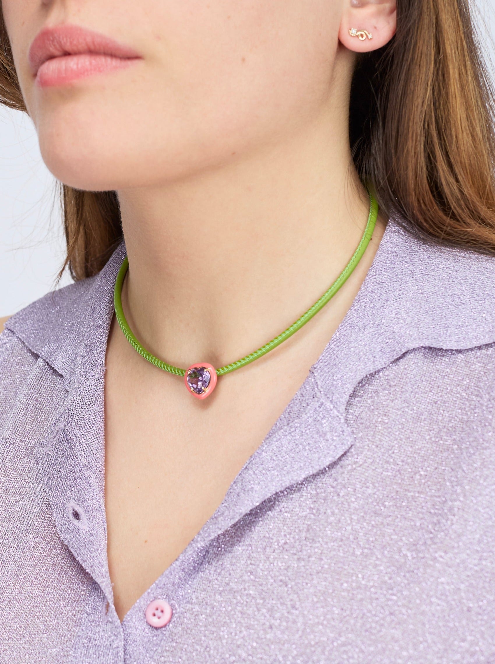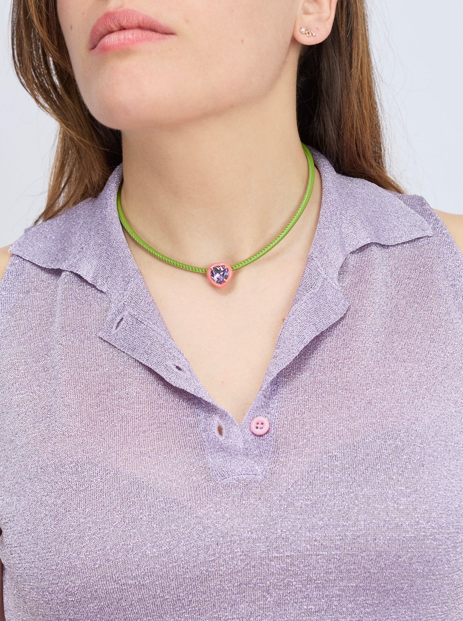 Pop Choker with Heart in Candy Setting in yellow gold and silver with heart cut amethyst and light pink enamel with adjustable green leather cord.