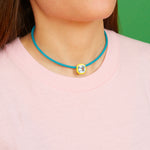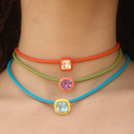 Pop Choker with Octagon in Candy Setting in yellow gold and silver with octagon cut rock topaz and yellow enamel with adjustable turquoise leather cord.